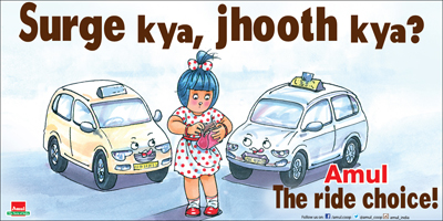 11. Our Amul Girl’s take on the controversy surrounding the surge pricing charged by Cab Service companies like Ola and Uber. She want’s to know “Surge Kya, Jooth Kya’?